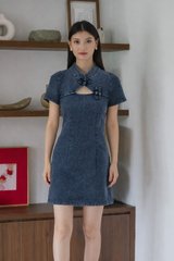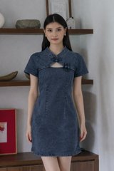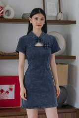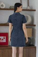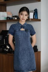 Quincy Denim Sleeved Qipao Dress in Dark Wash