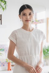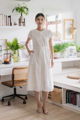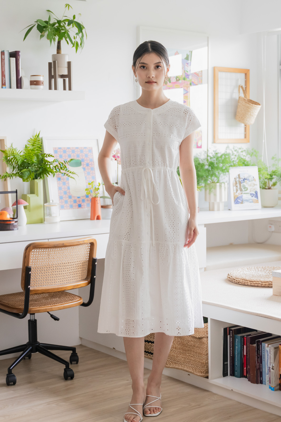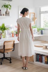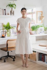 Calixa Eyelet Drawstring Buttons Midi Dress In White