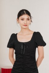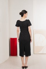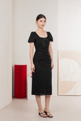 Rose Ruched Ribbonette Midi Dress In Black
