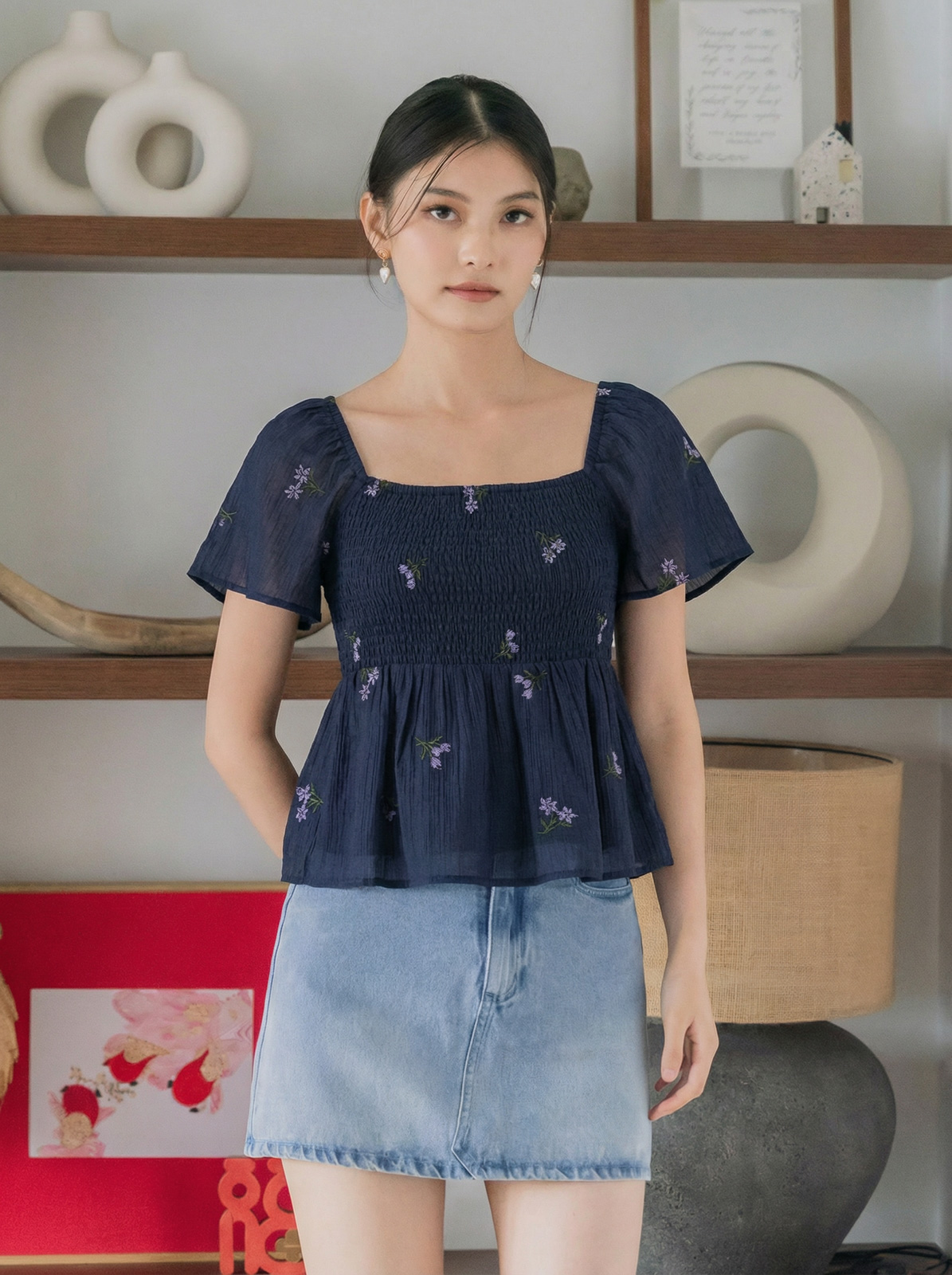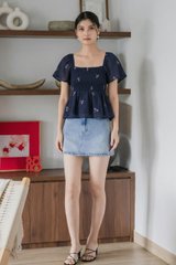 Cyra Floral Textured Smocked Top In Navy